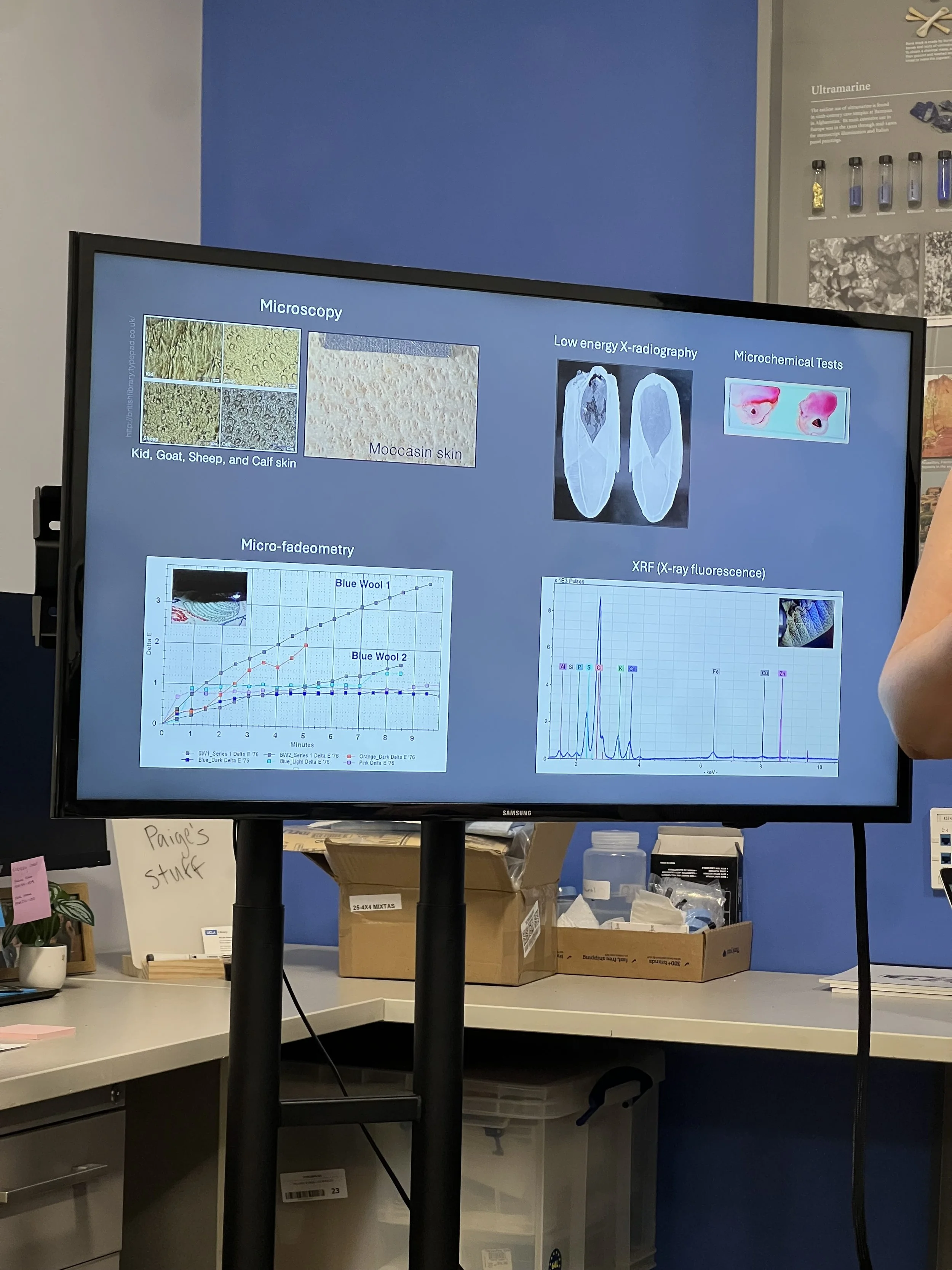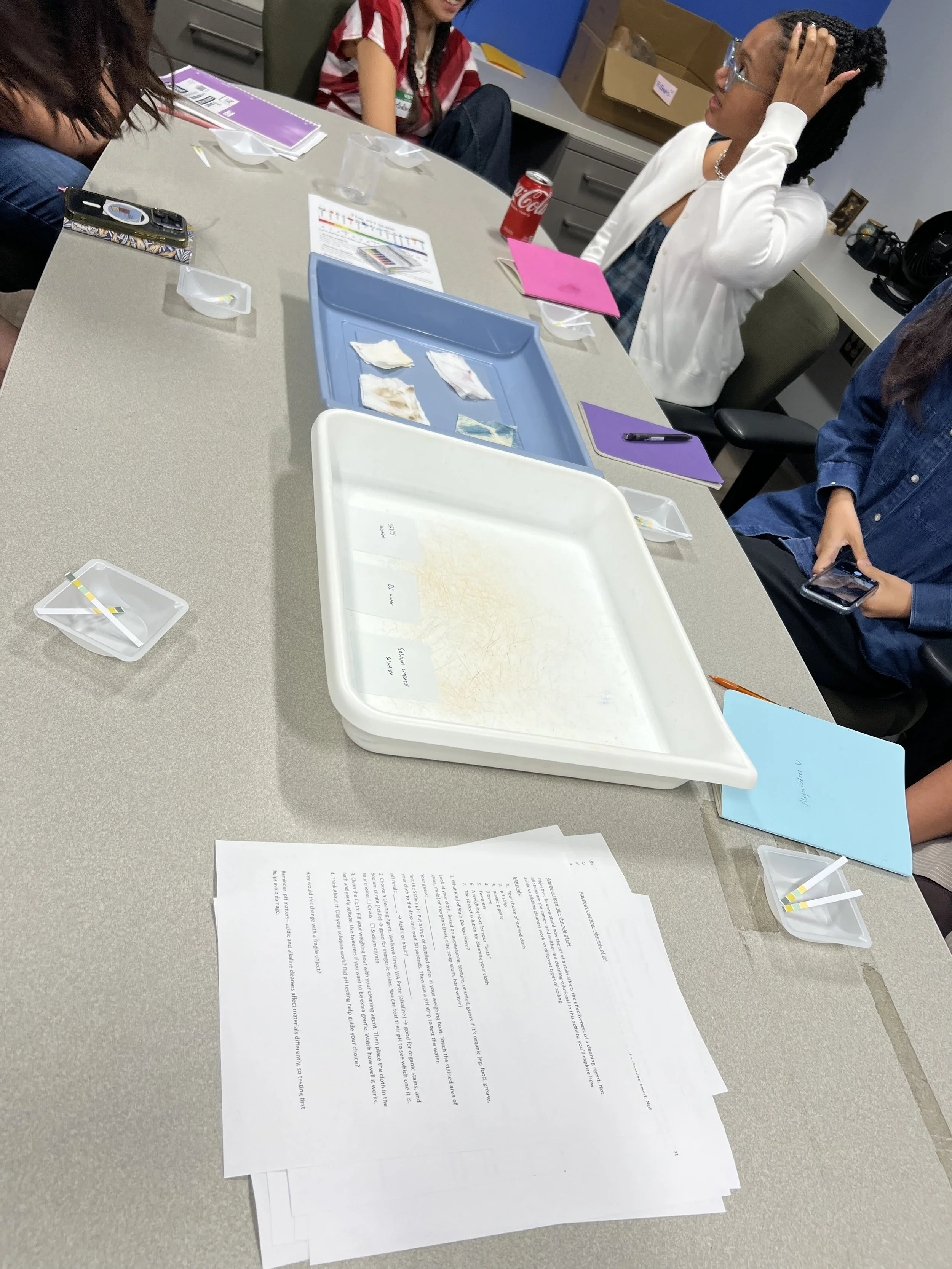 Hand skills and treatment methods practiced included safe object handling; structured object examination and documentation; collaborative condition report writing; photographic documentation set-up and image capture using multiple lighting geometries (normal, raking, etc.); hands-on technical examination using microscopy, UV illumination, and X-radiography (rotation-based practice); open-lab work applying the above tools to a personal or selected object for a final presentation; paper/book/archival conservation lab activity during the UCLA library conservation visit (paper conservation activity in a lab setting); practical cleaning exercises (rotation-based, following a presented workflow); loss compensation activity (group exercise focused on compensation approach and execution); preventive conservation activity (risk-aware storage, handling, and environmental framing); and material identification activity (hands-on identification approach guided by conservation context).