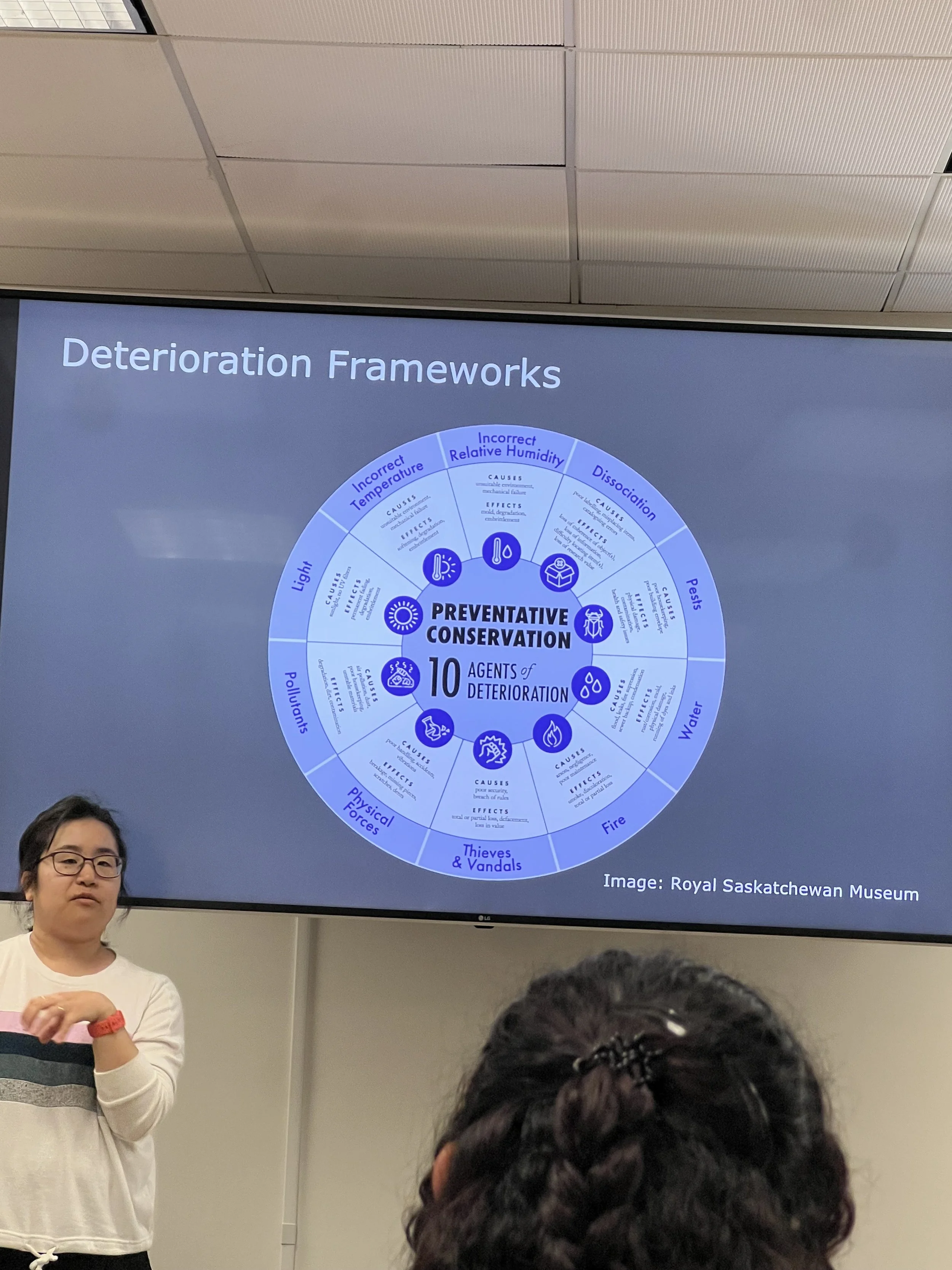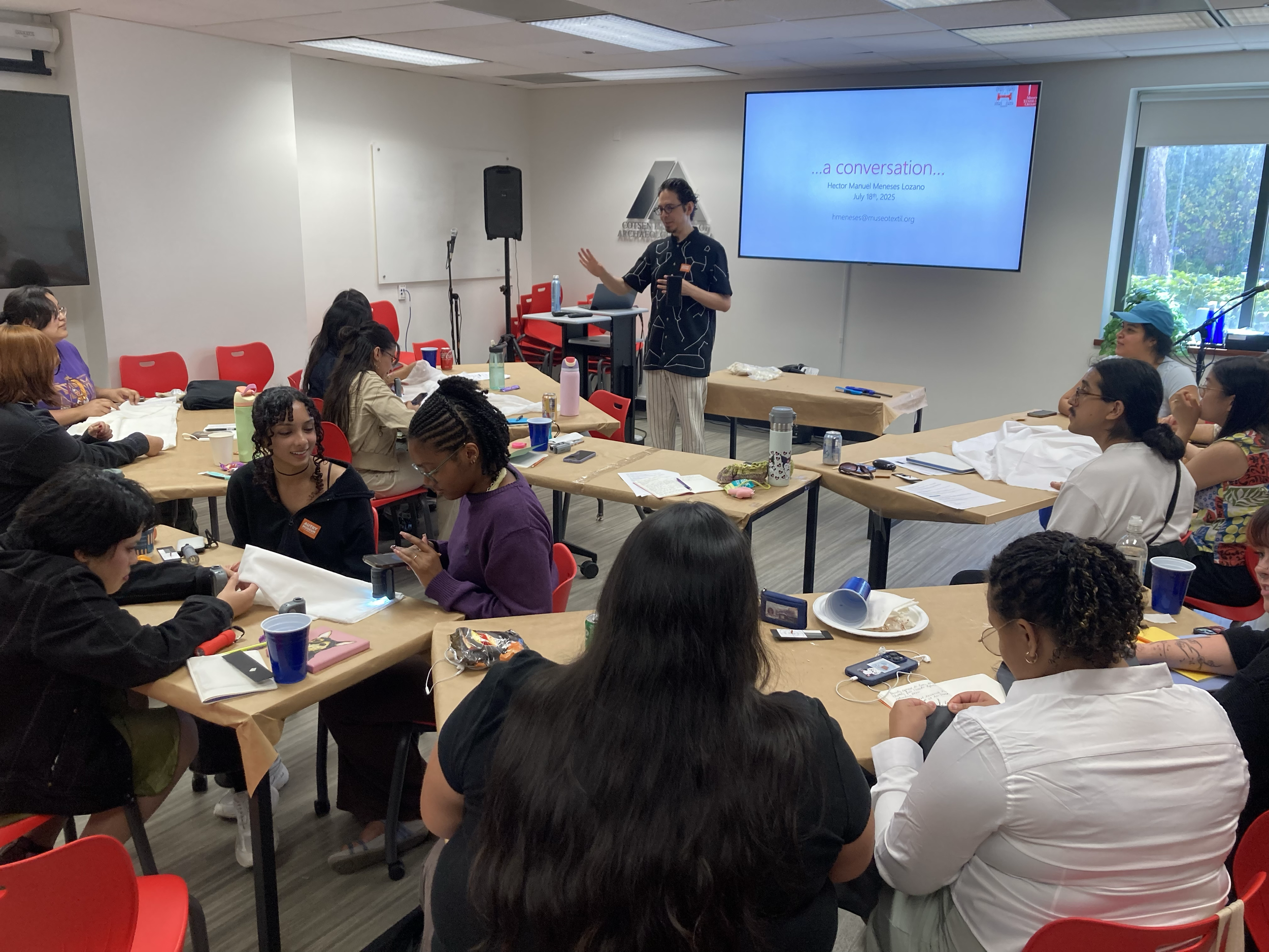 Selected lectures about conservation ethics and professional values; fundamentals of examination and writing museum-standard condition reports; photo documentation workflows and controlled lighting (normal illumination, raking light, etc.); methods of technical examination (microscopy, ultraviolet light, X-radiography); diversity and underrepresentation in conservation and museums; personal pathways into conservation careers; introductions to book, paper, and archival conservation; applying to graduate school and internships in the US; cleaning principles and decision-making; loss compensation concepts and ethical limits; preventive conservation strategies; Native voices in curatorial and conservation work; preservation in times of peril; community-centered textile collections (Oaxaca, Mexico); material identification basics; and repatriation work from inside and outside the museum.