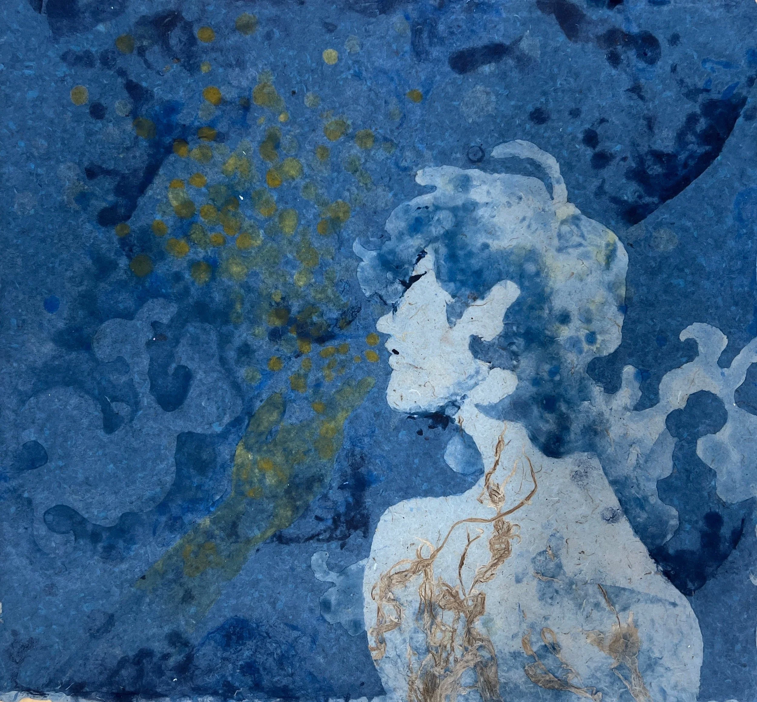 This piece captures the essence of this transformative moment through the medium of pulp painting on kozo paper. The upper paper sheet, crafted from a blend of abaca and ctotton, is meticulously cut to form the figure, while the figure itself is rendered in another sheet of kozo paper. This deliberate choice creates a striking interplay of opacity, heightening the contrast between the qualities of each paper type. The composition invites viewers to contemplate the duality of emotions inherent in grief: the weight of loss juxtaposed with the fragile tendrils of hope.