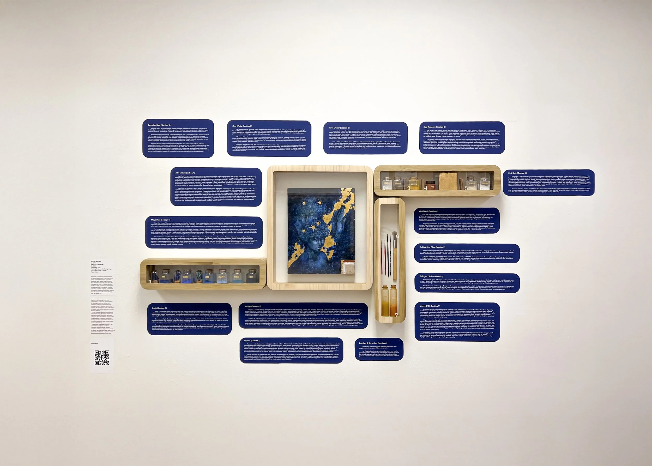 Pentimenti is a material investigation into the layered intersections of art, science, and history. Centered around six iconic blue pigments (Lapis Lazuli, Smalt, Egyptian Blue, Azurite, Indigo, and Maya Blue), the work takes the form of a cabinet-like box that houses both a tempera/oil painting and the materials used in its making. Through embedded scientific diagrams, it visualizes the chemical properties behind each material, from the pigments to the binders like egg yolk and linseed oil.
